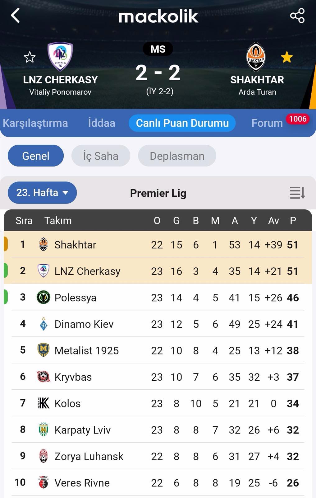 Arda Turan'ın ekibi ve zirve mücadelesindeki rakibi Cherkasy, 51 puana yükseldi. Cherkasy'nin bir maç fazlası bulunuyor.
